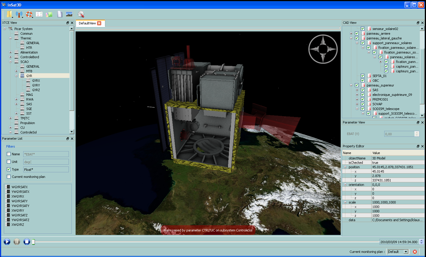 Services : Développement | Cours & Formation | Conseil | Veille Technologique Références : Curriculum Vitae | Publications | Portfolio Corba, JMS, Client-Serveur TCP/IP, C++, Java, Qt, Open Scene Graph inSat3D est un logiciel de supervision temps-réel et différé de système complexes, tel un satellite. Il intègre le modèle issu du design (CAO) et l'interface à la télémesure à travers une visualisation 3D animée en temps réel, permettant une approche système plus simple et plus rapide. Ce logiciel est utilisé dans le domaine de la formation des nouveaux opérateurs, dans le cadre de l’entraînement, de la communication, ou encore des opérations elles-mêmes. inSat3D a été déployé dans plusieurs centres de contrôle du CNES, d'Astrium ou encore de Thales Alenia Space.